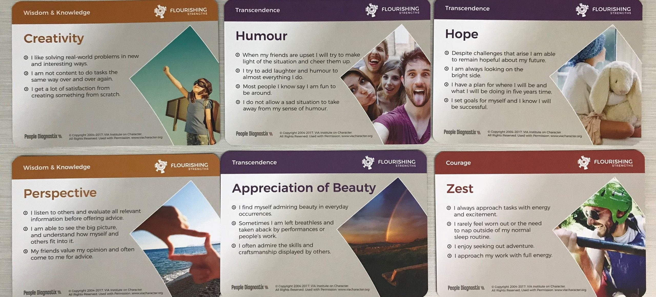 As a psychologist working with students who are struggling, I notice they are often lacking self-confidence and direction, making it difficult for them to identify their strengths of talent or skill, which is the focus in schools. However, everyone possesses strengths of character that can be readily identified. Almost every student I see will include an exploration of their signature character strengths, with my favourite tools being the VIA strengths survey and the Flourishing Strengths Cards. After completing a Flourishing Strengths card sorting task, I take a photo of the top strengths cards to keep in my case notes and provide the student a copy as an easy way for them to remember their strengths and a description of them.